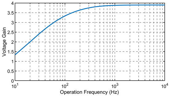 The voltage gain regulations at different operation frequencies is shown in Figure 4, where the range of the frequency is from 10 Hz to 10 kHz. In this case with the default set-up, selecting the frequency over 1 kHz makes the voltage gain on a stable condition. The higher limit of the frequency should be selected by falling and rising times of the switches.