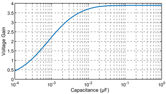 In the example case with the default set-up, the voltage gain regulations at different capacitances from 0.1 nF to 1 F is illustrated in Figure 5. This figure states that the voltage gains with the capacitances higher than 0.1 F are stable. To maintain 95% of the fully charged voltage, the capacitance is required to be lower than . With these conditions, the appropriate capacitance range can be expressed as follows