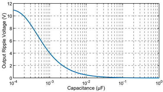 Using the ripple voltage of Equation (12) and the default set-up, the output ripple voltage at different capacitances of the output capacitor (from 0.1 nF to 1 F) is shown in Figure 7. The waveform in Figure 7 can provide the lower limit of the output capacitor capacitance. The range of the output capacitor capacitance can be expressed as follows