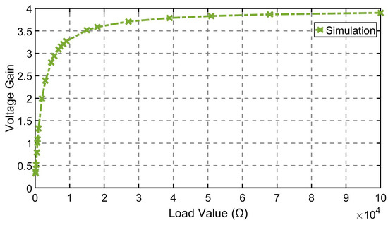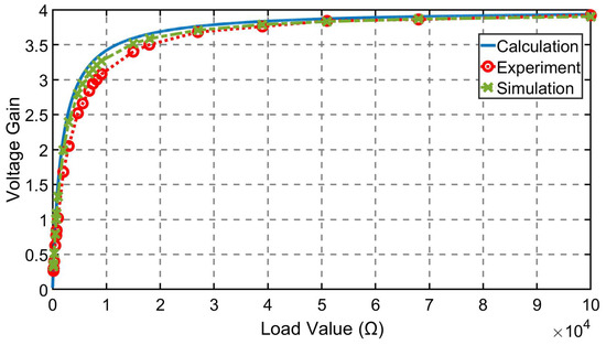 Comparison of the calculated, simulated, and experimental voltage gains at different load values.