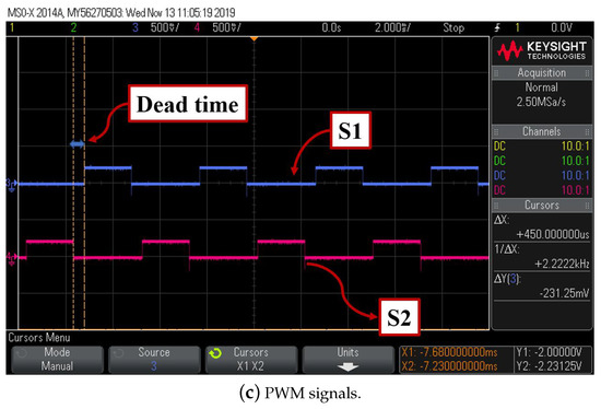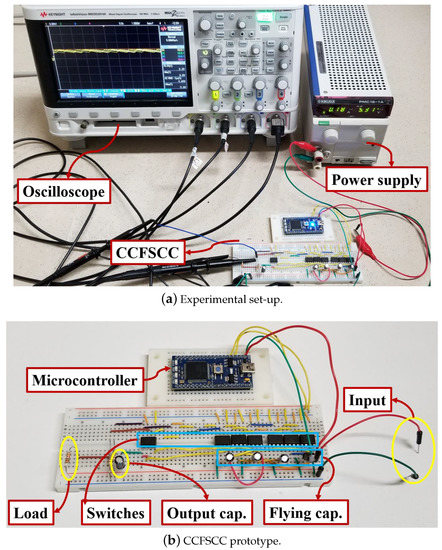 To affirm the accuracy of the proposed model, an experimental test was implemented with the circuit components in Table 3 and the experimental set-up shown in Figure 9a. In Table 3, is the on-time of the switches and is the dead-time. Figure 9b shows the prototype configuration of the CCFSCC. The CCFSCC is operated by the PWM signals, as shown in Figure 9c. Figure A1 describes the measured output voltages with the input voltage and the PWM signals at different load values (from 180 to 15 k). In Figure A1, yellow signals are output voltages, green signals are input voltages, and other signals are PWM signals.