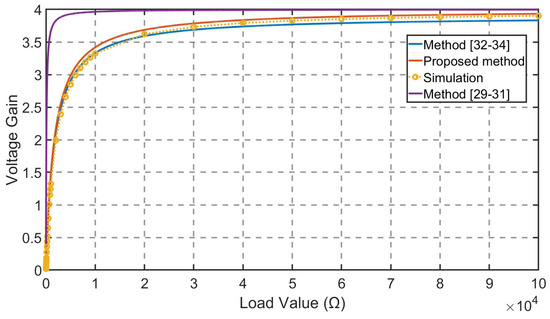 Comparison of calculated voltage gains from proposed and existing methods, as well as simulated ones, at different load values.