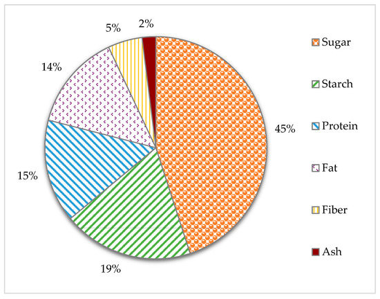 Various studies related to FW analyses from university dining centers have been reviewed for this study [17,18,19,20,21], and Figure 1 shows the average values of FW composition described in these studies. Even though the studies were performed in different regions, the results indicate glucose to be a principal component in FW, followed by starch. Glucose is a fermentable sugar that can be directly consumed by Saccharomyces cerevisiae and converted into ethanol under anaerobic conditions. This type of yeast is widely used in the corn ethanol industry, because it has a higher specific growth rate and productivity [22].