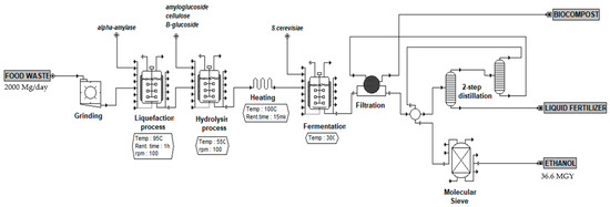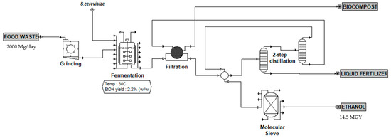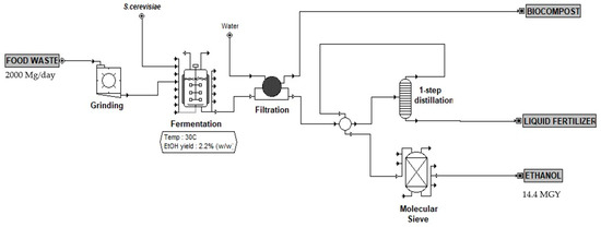 The conceptual process model for a FW fermentation ethanol plant was simulated using SuperPro Designer V9.0 (9.0, Intelligen, Inc., Scotch Plains, NJ, USA). In this study, FW was assumed to have 78% moisture content, with 45% glucose, 19% starch, 5% fiber (wet basis), and other trace elements. The plant feedstock was supposed to be 2000 Mg/day. At present, FW was expected to have no cost for feedstock. The waste stream from the conversion process was considered as a by-product, as mentioned in the previous section. In this conceptual simulation process, liquid and solid waste were separated using rotary filtration. The recommended moisture content of bio-compost was in the range of 40–60% by weight [30,31]. Therefore, in this study, bio-compost was maintained to have a moisture content of 40% by weight in order to limit microbial activity.