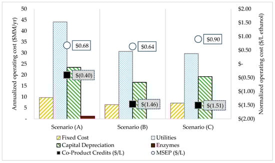 Scenario A had a higher in TPI and utility cost compared to the other scenarios. This was because, in this simulation, there were two additional unit operations to convert starch into fermentable sugar, as shown in Figure 2. These unit operations required different temperatures, which were 95 °C and 55 °C, which were used for the liquefaction and hydrolysis processes, respectively. In fact, here, the heating and cooling systems required more energy as compared to the other scenarios, thus leading to a higher annual utility cost. Utilities represent the process inputs of heat transfer agents, electrical power, and water. The heat transfer agents in this processing plant were chilled water, cooling water, and steam. For power demand, standard electrical prices were used when considering the power required to supply energy and operate the equipment. The price for each unit energy was obtained from [44] and used in the SuperPro Designer V9.0 software. Even though ethanol production was higher compared to the other scenarios, it did not have an impact in decreasing the MESP value.