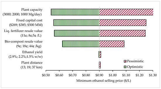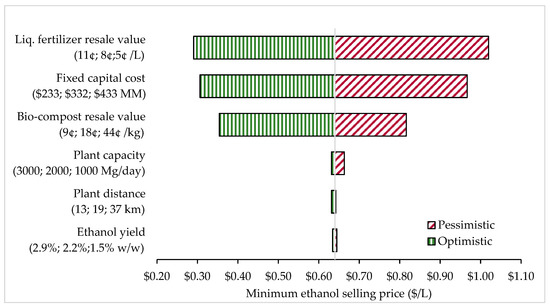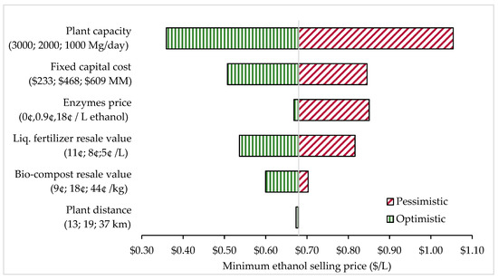 Sensitivity analysis was performed by changing one parameter value while holding all other parameters constant. This approach is important when identifying key variables that have high an impact on the MESP value (our key dependent variable). In this analysis, plant capacity (Mg/day), plant distance (km), fixed capital cost ($), ethanol yield (%), enzymes price (¢/L), liquid fertilizer (¢/L), and the bio-compost (¢/kg) credit value ($/L) were selected for evaluation. The price range for bio-compost was taken from national compost price [41] The enzyme price range was assumed to be from zero cost to 18¢/L ethanol, as found by Klein-Marcuschamer et al. [42]. For the other variables, a range of ±30% was used to estimate the MESP ($/L) from an optimistic, base case, and pessimistic point of view for each case, as suggested by previous studies [34,35,43]. Additionally, the effects on an IRR of 10%, percent of equity with an 8.25% interest rate, and a ten-year loan, were also examined in order to understand their impacts on the MESP. All selected parameters for the sensitivity analysis are shown in Table 3.