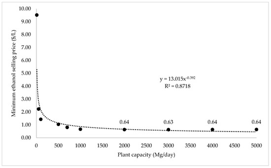 Figure 10 shows the economies of scale for this process. These exist when the increasing size of plant capacity will result in a lower MESP. From the graph, there was a power relationship of −0.392 between MESP and plant capacity. This also indicates that with the feedstock rate varying between 10 and 5000 Mg per day, the MESP of ethanol ranges from $36 to $2.43 per gallon ($9.5 to $0.64 per liter) of ethanol. It clearly shows that diseconomies of scale happen when the plant capacity increases to 3000 Mg per day. Thus, the size of plant capacity should not be larger than 3000 Mg daily in order to make the project economically feasible.
