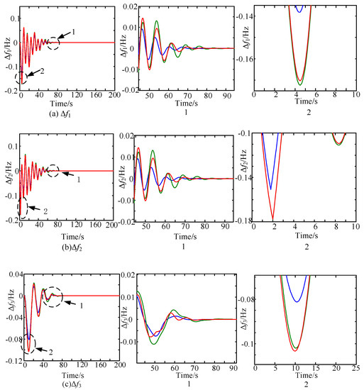 (1) The nominal parameters of all units in areas I, II, and III are reduced by 50% and increased by 50%, and the control strategy of Scheme 3 remains applicable. The simulation results are shown in Figure 5. As the unit parameters increase, the suppression effect of the control strategy on the frequency deviation and tie-line power deviation caused by disturbance decreases to a certain extent, but the stable operation of the system can still be ensured.