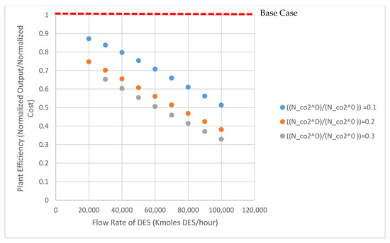 The overall sizes of both systems are determined primarily by the Henry’s law constant. Values smaller than those shown in Table 3 and Table 4 require pressures where the Henry’s law cannot be considered to be consistently accurate. At those smaller system sizes concentrations of CO2 greater than 3% are needed to remove even the lowest amount of CO2 (10%). It is important to also consider that these are simply reference cases of well-established DES, and that this process model is to be used in searching for an applicable DES in the future as new research progresses.