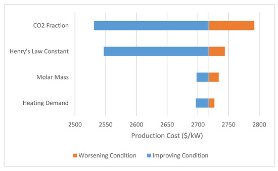 The sensitivity of the model was evaluated using ChCl:Urea as the base model. A tornado plot is shown in Figure 5 detailing the effect of various parameters on the system. Each specific parameter range is shown in Table 2. As is expected, the Henry’s law constant has a large impact on the system’s economic feasibility (relative cost compared to the baseline to achieve a similar result). For this particular usage of Henry’s law constant (bars/(mole frac)), it is expected that as the value approaches zero the absorbed moles approach infinity. This sensitivity is a result of this mathematical effect, though the overall impact of the ability to dissolve CO2 is obviously important for absorption applications. For most of the DES described in the literature, Henry law constants ranging from 80 to 200 bar/(mole frac) can be expected [11,28]. In a similar fashion, changing the CO2 concentration has an almost equally large impact on system feasibility. Typical CO2 concentration ranges expected in flue gases from coal fired power plants are 10–15%, with this analysis being completed towards the upper end of that range [29]. Changing the heating demand of the solvent, even by a significant amount, does not significantly impact the system pressure. As the field of DES research progresses and solvents are optimized, this heating duty may be more important. But given the wide range of DES evaluated here, its effect is muted.