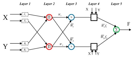 is the output of layer, is the membership function, and are incoming signals. and depict the node and layer numbers, respectively.