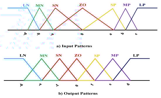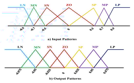 IF is MN and is SN, THEN output will be MP. It is important to say that membership function is called LN (Large negative), MN (medium negative), SN (small negative), ZO (Zero), SP (small positive), MP (medium positive), and LP (large positive), which have been shown in Figure 3 [].