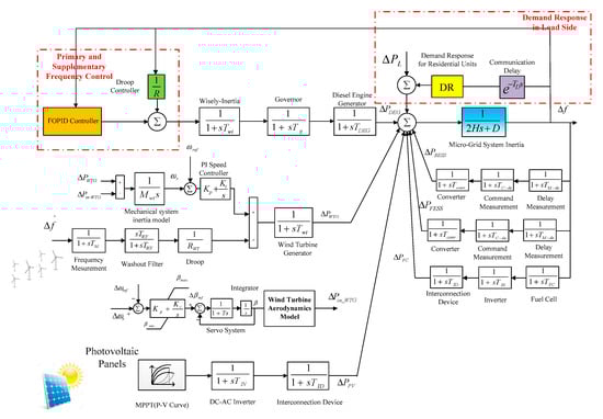 There are different types of dynamic models in the former researches for MGs [,]. For instance, in [,,], simplified dynamical models for renewable energy resources as well as energy storage systems (ESSs) have been taken into account as the first-order dynamical frequency models It is important to note that low-order dynamic models may be applicable apparently but they cannot include all dynamic aspects of the frequency behaviour related to parametric uncertainties and climatic patterns including wind power fluctuation and changes in the solar irradiation. Figure 4 shows an MG dynamical frequency model, along with two varied control mechanism including primary and secondary frequency control (LFC) in the generation side as well as demand response program in the load side. In the following step, all relevant parameters of this decarbonized system for a typical MG are represented in Table 2 during different situations [,,].