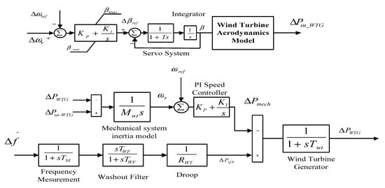 According to the proposed dynamic WTG model, which has been shown in Figure 5, a constant droop which is a symbol of virtual inertia (i.e., hidden inertia) of rotational masses is proposed (). This droop can play an active role in enforcing generation units to inject active power and improve the frequency deviation while some critical events occur. In order to obtain frequency deviation () more precisely, two different device including measurement device and a washout filter which is a high-pass filter are introduced.
