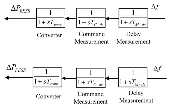In the layout of microgrids, energy storage systems play an important role in providing sufficient energy for isolated MG within a short period of time in order to protect system stability. It is often argued that it takes a period of time to charge FESS and BESS, and consequently, considering time constants for different components which are used in the structure of energy storage system appears to be necessary []. In a great number of previous studies, both BESS and FESS are regarded as the first order models which lead to neglect some dynamic behaviour of ESSs as well. This work expresses the BESS and FESS transfer function as a three-block diagram including frequency measurement device, command delay device as well as converter block in order to consider more accurate dynamic behaviour of ESSs. In fact, for the presented model, is time constant for measurement device, is a symbol for delay of command device and is a time constant for DC to AC converter model according to Figure 7.
