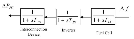 During frequency studies, the fuel cell is well known as a green energy resource and introduced by three different dynamic blocks including an inverter topology which can be deployed in order to convert DC voltage to AC voltage. Another important block is an interconnection device which links this distributed generation to the power grid in a pragmatic way. Although the fuel cell has a high order characteristic, a three-order structure is adequate for frequency control studies []. These three blocks have been illustrated in Figure 8.