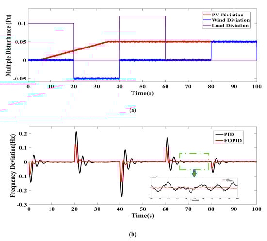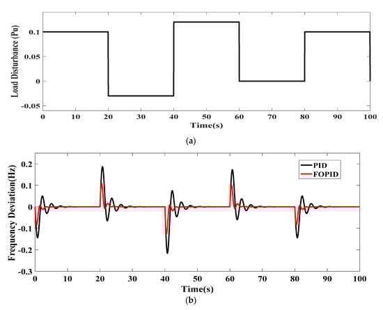 Over the last decades, renewable energy sources (RESs) have played a significant role in the generation of electricity and meeting consumers’ requirement due to recent environmental concerns as well as excessive changes in weather conditions. Although using distributed generations (DGs) like wind turbine generators (WTGs), solar panels, diesel engine generators (DEGs), and energy storage systems (ESSs) such as battery energy storage systems (BESSs) as well as flywheel energy storage systems (FESSs) has brought definite advantages to the ecosystem, this trend may contribute to some new challenges such as complexity in the frequency control mechanism, modern power systems weaknesses, and voltage instability [,]. As a result, among all the mentioned problems, keeping a balance between consumption rate and generation level is one of the main challenges in relation to the low-inertia microgrids (MGs) due to lack of rotational masses []. In fact, the coexistence of different types of renewable energy sources (RESs) with their various capabilities may lead to the several concerns associated with the control and stability of MGs []. It is important to note that the stand-alone type of microgrid may deteriorate these potential problems to a certain extent and yield more satisfactory performance during load disturbance and operational conditions in comparison to the conventional power plants topologies which have a close collaboration with other areas as well.