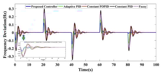 Due to the ever-increasing penetration of renewable energy sources (RESs) on the large scales, the stability of isolated MG during frequency excursion is becoming more challenging. Consequently, it seems that the tendency to deploy intelligent control methods, such as learning-based controller during parameters uncertainties can be a practical solution in the hybrid microgrids. Other paper emphasizes that the high rate of change of frequency (RoCoF) in isolated MGs require experts to deploy more intelligent methods for fast frequency response. As a result, a new frequency control approach based on the fuzzy-logic knowledge has been presented in a stand-alone hybrid microgrid including distributed generations []. In addition, an adaptive neuro-fuzzy controller is used in order to achieve an acceptable performance in the isolated microgrid including different kinds of distributed energy resources (DERs) such as wind turbine generators, solar panels as well as gas micro-turbines []. The acquired simulation results indicate that the proposed controller improve frequency behavior and decrease settling time in comparison to the conventional controllers as well. Another non-linear controller, which is called an optimized fractional-order proportional-integral-derivative (FOPID), has been proposed to regulate active power injection of fuel cell due to more satisfactory performance of this controller in comparison to the traditional ones. The outcome of mentioned research shows that the proposed controller provide a faster response and small overshoot compared to established controllers []. Recently, the tendency to deploy algorithm-based non-integer controller during load frequency control of microgrids have increased dramatically. In [], authors have deployed butterfly optimization algorithm (BOA) for various types of integer and non-integer controllers and compared this assumed method with other commonplace algorithms such as PSO, FA, and whale optimization algorithm (WOA) in order to declare the efficiency of their proposed method. In another research, a developed heuristic optimization technique, which is called water cycle (WCA) algorithm, is suggested so as to adjust a FOPID controller for effective frequency control of renewable-based isolated two-area interconnected microgrid (ICμG) []. This paper illustrates the excellence of WCA-based FOPID controller during various situations with regard to different load disturbances, wind speed variation with real data, and solar irradiance.