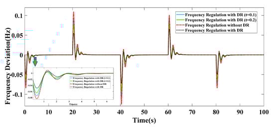 In [], a comprehensive strategy is regarded as control mechanism by deploying the plug-in hybrid electric vehicles (PHEVs) and controllable gadgets in order to alleviate frequency excursion during some challenges in relation to the power plants. Moreover, Benysek et al. [] have introduced a stochastic decentralized active demand response (DADR) for the frequency regulation of a power plants. The results of investigations have proved that the proposed stochastic DADR method in this paper, due to its high dynamic response in dealing with disturbance phenomena, can be deployed as part of both the primary and the supplementary load frequency control in modern power systems. Although simulation results depict that this proposed technique can improve the frequency deviation of power system, renewable energy sources don’t participate in the frequency mitigation. Moreover, different types of parametric uncertainty as well as communication delays are not considered in the presented model.