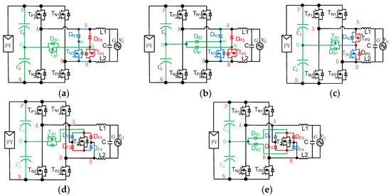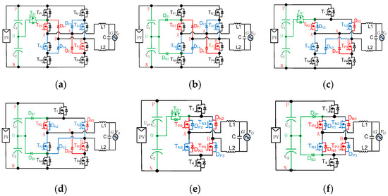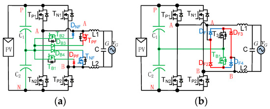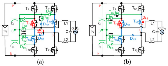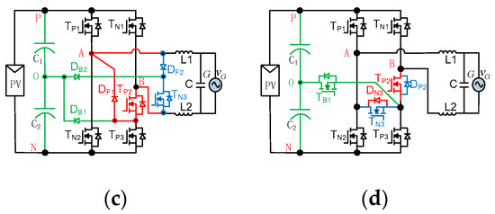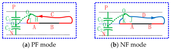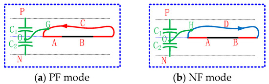 Figure 4b shows the NF mode operation. The additional switches marked by the green branch are inserted into the freewheeling branch , and is connected to the midpoint O due to the injection of .