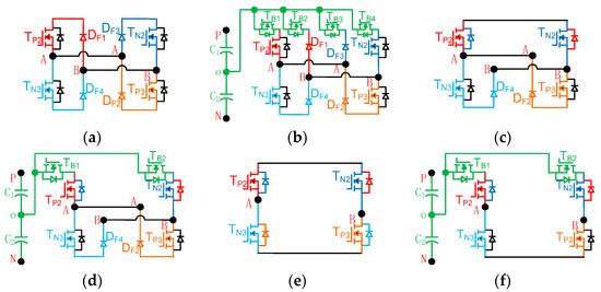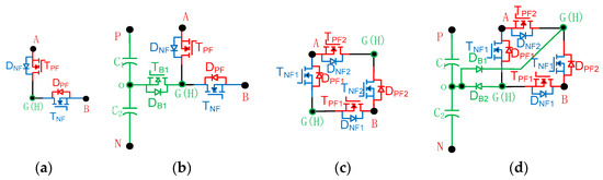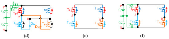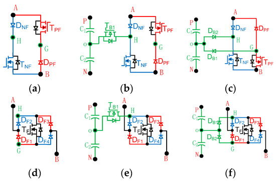 Figure 9 shows all the NPC topologies under M = 2, N = 3 or M = 3, N = 2. An extra switch, TB1, is added to flow bidirectional current, as shown in Figure 8b and Figure 9a,d. Two extra diodes, DB1 and DB2, are added to flow bidirectional current, as shown in Figure 9c.