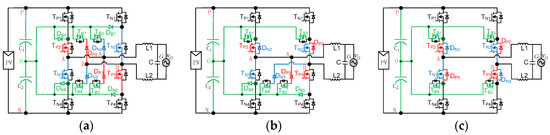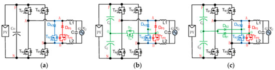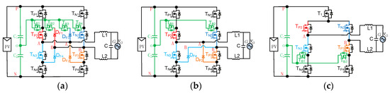 Indirect Connection NPC topologies R1S1 under M = 2, N = 2. (a) HERIC topology R1; (b) R1S1-1; (c) R1S1-2 [50,51].