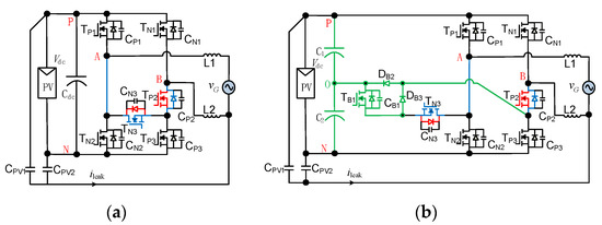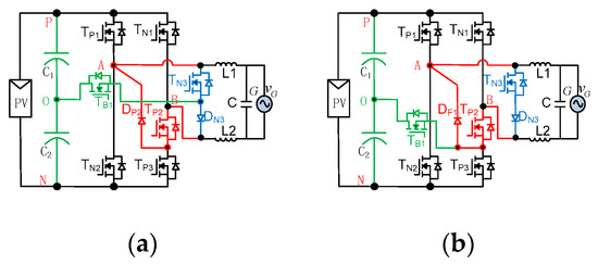 The HERIC topology, named R1 in Figure 7a, is well known. Points A and B are short-circuited in PF mode (the red branch from point B to A) and NF mode (the blue branch from point A to B). The current flows to point B through TP3, DP3 to Point A in PF mode, and flows point A through TN3, DN3 to point B in NF mode. The DC capacitor Cdc is split into two series capacitors, C1 and C2, to provide half the input voltage shown in Figure 7b,c. According to Rule #1, switches TP3 and TN3 are on. An extra switch TB1 is added so that point B is clamped to point O, as shown in Figure 7b. As shown in Figure 7c, two additional diodes, DB1 and DB2, are added to guarantee that point B is clamped to point O.