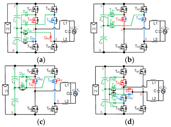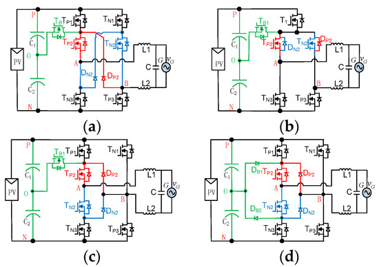 Figure 13 shows the Direct Connection NPC cell circuits based on the topology family with an extra diode. Two freewheeling cell circuits are introduced in Figure 13a,c, respectively. The switches TPF and TNF in the NPC cell are on in both PF and NF mode, based on Rule #1. According to Rule #2, the extra switches, TB1, TB2, and extra diodes, DB3, DB4, are inserted into the freewheeling cell in Figure 13b. As shown in Figure 13b, the midpoint O is connected to point B (or point A) through the extra switch TB1 (TB2) and extra diode DB4 (DB3). The midpoint O is connected to point B through the extra switch TB1 shown in Figure 13d. It is observed that the freewheeling cell is changed due to the injection of extra switches and diodes.