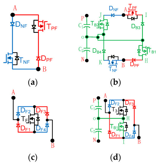As described in Part I of this paper, there are two freewheeling cell circuits based on the topology family with an extra diode, as shown in Figure 5a,d. For Figure 5a, the current flows from point B to point A through switch TPF and diode DPF in series, and from point A to point B through switch TNF and diode DNF in series. In Figure 5d, the current flows bidirectionally between points B and A through the switch TF, which is kept on in both PF and NF modes.