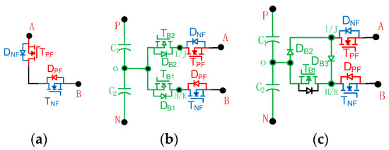 Direct Connection NPC cell circuits based on topology family without an extra diode. (a) freewheeling circuit; (b) NPC cell #1; (c) NPC cell #2.