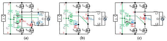 In order to show how the Direct Connection NPC topology R2S2 is derived based on HERIC topology R2, it is illustrated in Figure 15. According to Rule #1, switches TP3 and TN3 are on in PF and NF modes. As shown in Figure 15b, two extra switches, TB1 and TB2, are inserted so that point B or point A is clamped to point O based on Rule #2. In Figure 15c, two extra diodes, DB2 and DB3, and one extra switch, TB1, are inserted to guarantee that point B is clamped to point O.