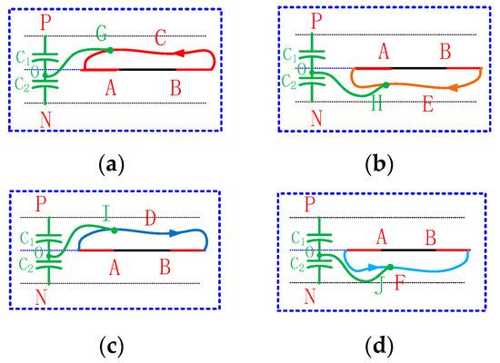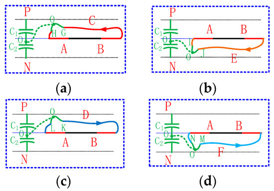 Figure 4 shows a schematic diagram of the Direct Connection of the unified NPC cell for USPWM. As shown in Figure 4a, additional switches marked by the green bump branch are inserted into the freewheeling branch , so that is connected to the midpoint O. Points H and I are from the freewheeling branch.