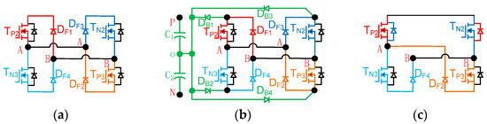 Figure 17 shows all the NPC topologies under M = 2, N = 3 or M = 3, N = 2. Two extra switches, TB1, TB2, and two extra diodes, DB3 and DB4, are inserted so that point B or A is clamped to point O, as shown in Figure 17a. Two extra switches, TB1, TB2, are inserted in Figure 17b. One switch, TB1, and two diodes, DB2 and DB3, are inserted in Figure 17c.