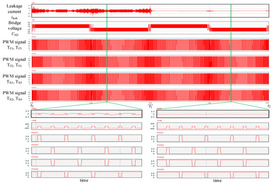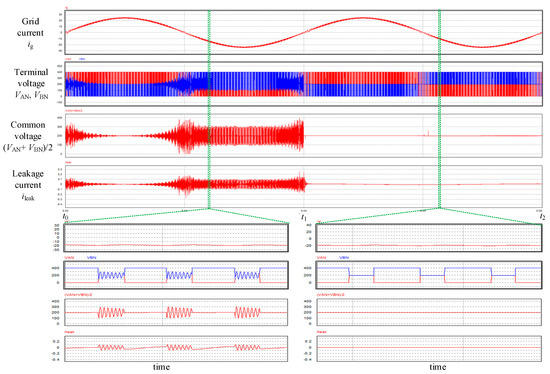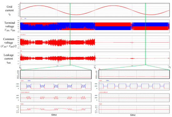 Figure 28 shows the waveforms of CM voltage and leakage current. In t0–t1, the topology H6 without the NPC cell works, and the CM voltage (VAN + VBN)/2 does not remain constant. The CM voltage includes high frequency resonant voltage in freewheeling mode, as terminals A and B are floating (VAN = VBN). The leakage current is 100 mA. In t1–t2, the topology H6 with the NPC cell works and the CM voltage (VAN + VBN)/2 always remains constant. The leakage current is reduced from 100 mA to 2 mA.