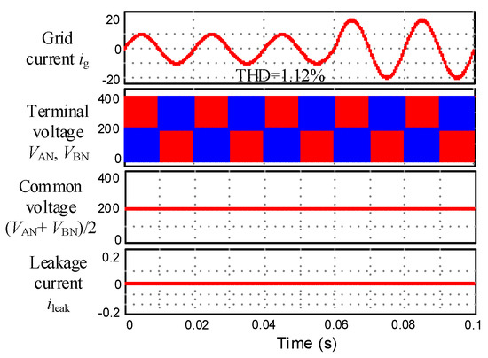 Figure 29 shows the waveforms of the grid current, terminal voltage, CM voltage, and leakage current with the parameters listed in Table 7. The THD of the grid current is about 1.12%. As we can see, the CM voltage is maintained at 200 V with small fluctuations over the whole power line period; thus, the RMS value of the leakage current is only 3 mA. Figure 30 shows the waveforms when the load steps at t = 0.06 s. The THD is still 1.12%. The CM voltage and leakage current have the same values as those in Figure 29.