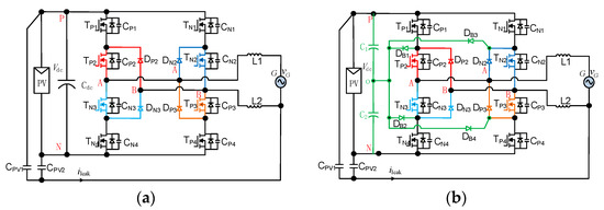 The leakage current can be limited in full-bridge transformerless inverters if the common mode (CM) voltage is zero [9,10]. Some state-of-the art-topologies, such as the H5 inverter topology [11], as shown in Figure 1a, HERIC [12,13], and H6 inverter topologies [9,14,15,16,17,18,19,20,21,22,23,24,25,26,27,28,29,30,31,32,33,34,35,36,37,38,39,40,41,42,43,44], have been developed from the full-bridge inverter topology. However, there is still a small leakage current as the CM voltage no longer remains constant under parasitic parameter inflection throughout the whole line-frequency (50 Hz or 60 Hz) period. The CM voltage is indeed variable in freewheeling mode because of the potential variation induced by the charging of the switch junction capacitance. The Neutral Point Clamped (NPC) technique is introduced in these topologies to achieve zero leakage current [45,46,47,48,49,50,51,52].