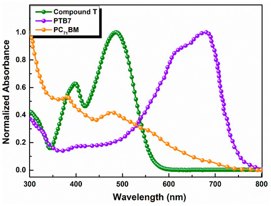 Normalized UV-Visible absorption spectra of Compound, PTB7 and PC71BM in thin films.