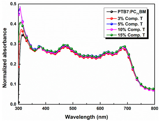 In Figure 3 the absorption spectra of the ternary active layers are illustrated. It is observable that the absorption intensity slightly increased as the concentration of compound T got 5% across the full spectrum range and especially between 400 and 560 nm, where the host PTB7 and compound T spectra overlapped. Moreover, the common peak of compound T and fullerene derivative PC71BM got higher values, while the absorption peak of PTB7, decreased. According to relevant existing literature [73], two broad absorption peaks at around 614 and 682 nm are attributed to the characteristic π–π* transition of the PTB7 polymer.