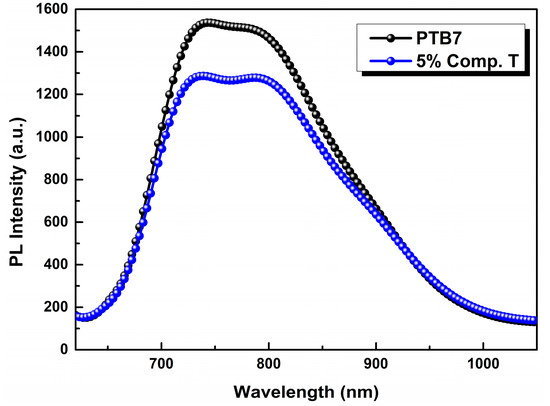 Photoluminescence (PL) spectra of PTB7 (black) and PTB7:compound T (5%; blue) thin film on a Si substrate.