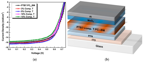 A schematic representation of the inverted ternary OSC structured as ITO/PFN/PTB7:compound T:PC71BM/MoO3/Al is depicted in Figure 5, while the respective configuration and energy diagram of the device with the HOMO and LUMO energy levels of the materials selected are depicted in Figure 1. Due to the energy level offset between PTB7 [74], compound T [70] and PC71BM [74] (3.31 eV, 3.58 eV and 4.3 eV in LUMO level and 5.15 eV, 5.48 eV and 6.0 eV in the HOMO level, respectively) the charge transfer is enhanced. This is clear evidence, that the addition of compound T up to an optimum concentration, promoted the electron-cascade effect. More specifically, excitons are dissociated at the D:A interfaces throughout the blend layer. Since the HOMO levels of compound T and the conjugated polymer PTB7 perfect match, holes’ transport was facilitated through the compound T en route to the anode electrode. In Figure 5, current-to-voltage characteristics based on the PTB7:PC71BM and the ternary PTB7:compound T:PC71BM active layers, are also depicted. The corresponding PV performance parameters are listed in Table 1. The reference binary device exhibited a short circuit current density (Jsc) of 16.10 mA cm−2, an open circuit voltage (Voc) at 0.72 V, a fill factor (FF) at 64.6% and a PCE of 7.51%.