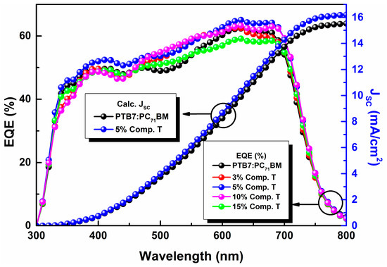 As shown, Jsc did not follow the rising trend of compound T concentration, but instead it increased from 3% to 5% and then started to decay as the concentration of compound T got higher values. This was attributed to the degradation of the interfaces between compound T and the polymer donor material. On the other hand, the Voc obtained in the ternary cells was almost identical to the binary PTB7:PC71BM, reflecting that charge transfer state energy (ECT) does not change upon the addition of Compound T [75].