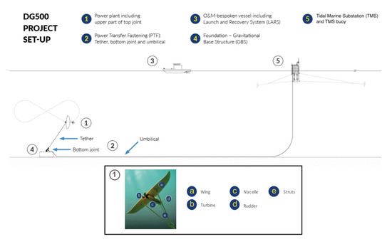 Figure 1 represents a schematic of the model of the tidal energy array assessed in this study, and Table 1 contains its main system specifications [14]. Each DG500 kite was connected to its gravity base foundation by a tether (containing the umbilical system) through the bottom joint. Every group of six DG500s was connected to a tidal marine substation (TMS) located on a floating buoy, which was connected to the onshore substation. It was assumed that the array would consist of 24 installed DG500s and four TMS buoys, one of which would also act as a substation. Furthermore, an additional two spare DG500s were assumed to be located onshore to facilitate efficient service and maintenance. The substation in turn was connected to the UK national electricity grid. The array was assumed to have a lifetime of 25 years.