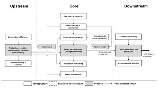 The functional unit was chosen as one kWh of electricity delivered to the consumer connected to the UK grid. The study included the cradle-to-grave production and operation of the entire array, covering the extraction and production of raw materials, transportation, manufacturing, installation, operation and maintenance, and end of life (EOL). It also included the production of factories for the processing of materials, the manufacturing of subsea export cables, the building of an onshore substation and maintenance center, and the UK grid.