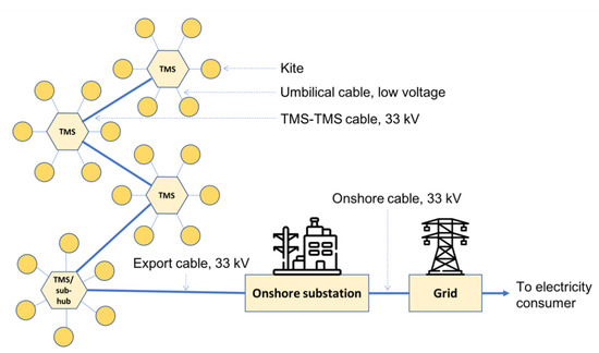 There are four types of cables that transfer the electricity from the kite to the grid: the umbilical cable, the TMS–TMS cable, the export cable, and the onshore cable (Figure 3).