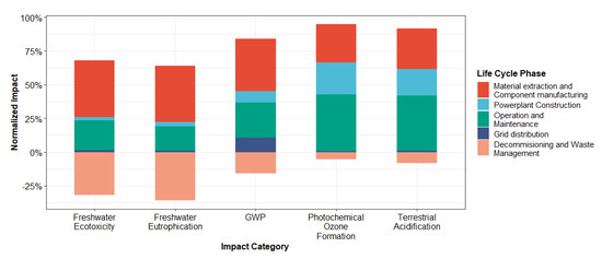 Overview of some assessed impact categories normalized to 100%, for the base case scenario. The bar segments represent the different life-cycle stages. Processes contributing to less than 1% were excluded.