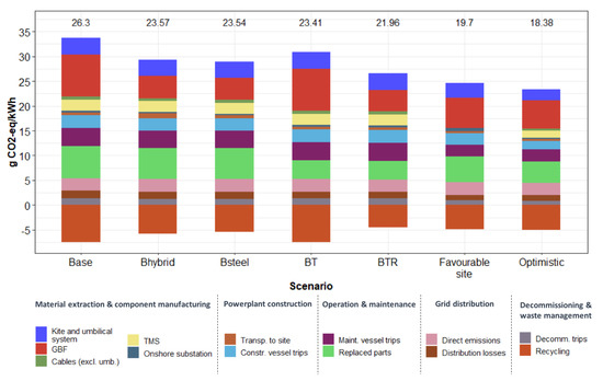 Figure 5 shows the GWP impact results of different scenarios defined in Table 3. As expected, it can be seen that the largest potential of improvement comes with increased power output (i.e., optimistic and favorable site). Changing the material of the gravity base foundation (Bhybrid and Bsteel) shows that there is not much net improvement compared to the base case. However, extending the lifetime of the tether and reusing the GBF (BTR) shows a larger potential improvement. This also shows how sensitive the results could be to the EOL assumptions, where excluding that phase (assuming no recycling) would give more variations in results.