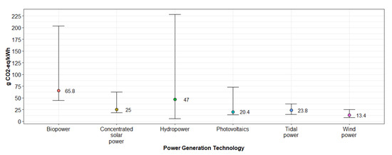 Comparison of the global warming potential (gCO2-eq/kWhe) values of the tidal power generation technologies (Table 4) with other power generation technologies assed by Hertwich et al. [24]. Wind power includes onshore and offshore technologies, and photovoltaics include ground and roof versions of the polycrystalline, CIGS, and CdTe technologies. The limits shown represent the minimum, maximum, and median (to which the value shown corresponds).