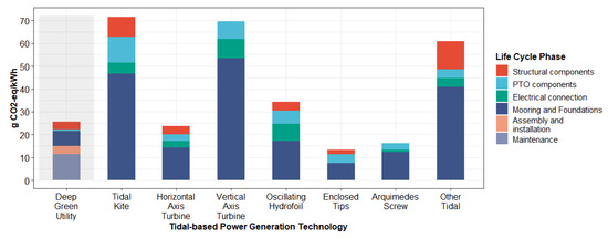 A comparison of the GWP results of the tidal current technologies found in the literature, including the DG500 array (Table 4), with selected renewable energy generation technologies assessed by Hertwich et al. [24], is shown in Figure 6. Note that in the tidal power results, Annapolis was excluded because its structure is similar to a hydropower plant; Severn barrage was too, because it is similar to a dam. Crest energy was also excluded because the data used were just a rough estimation, and a thorough study was not done. For other technologies, the graph excludes the impact of fossil based technologies, i.e., coal and natural gas power plants, to avoid out-of-scale representation of significantly more impactful technologies. It also excludes nuclear power plants, because they use non-renewable fuel, and to avoid misleading conclusions of neglecting its negative impacts in other categories, regarding the controversial issues of nuclear waste, nuclear accidents, and nuclear weapons.