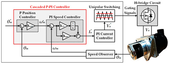 Figure 1 illustrates a block diagram of the EGR valve position control system using the DC motor as the actuator. The system consists of the EGR valve, the H-bridge circuit, and the position control system. In the position control system, the cascaded P-PI controller is mainly used and has a structure that connects the P-position controller and the PI-speed controller in series [16]. To obtain the motor angular speed ωm of the PI-speed controller, the speed estimation through the derivative of the motor angular position θm causes the noise by the derivative or the delay by the filter. In [17], the speed observer enables the speed estimation without problems of the derivative, and the speed observer is applied to obtain the motor angular speed in the system.