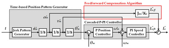 Figure 4a shows the acceleration command feedforward control loop of the PI-speed controller in the speed control system [13]. The velocity pattern created through the integral of the acceleration command is used as the speed command, and the acceleration command is compensated to the speed controller. However, in the position control system using the cascaded P-PI controller, the speed command is the position controller output, as shown in Figure 4b. The acceleration command generated through the derivative of the speed command is compensated to the speed controller. The transfer function of the position control system is derived as follows: